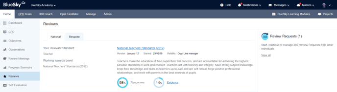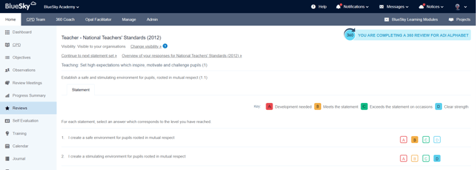 It is often helpful for a member of staff looking to develop their skills to review themselves against a set of relevant standards. The process can be further enhanced by gaining a perception of how others see them in those same areas of work using a 360 review.