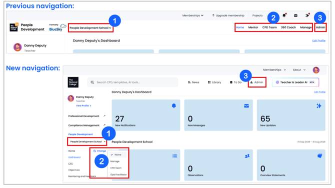 To improve the look and feel of People Development, and align it to the navigation within The National College, the role and school selectors have now moved from the top navigation, into the left hand navigation bar.